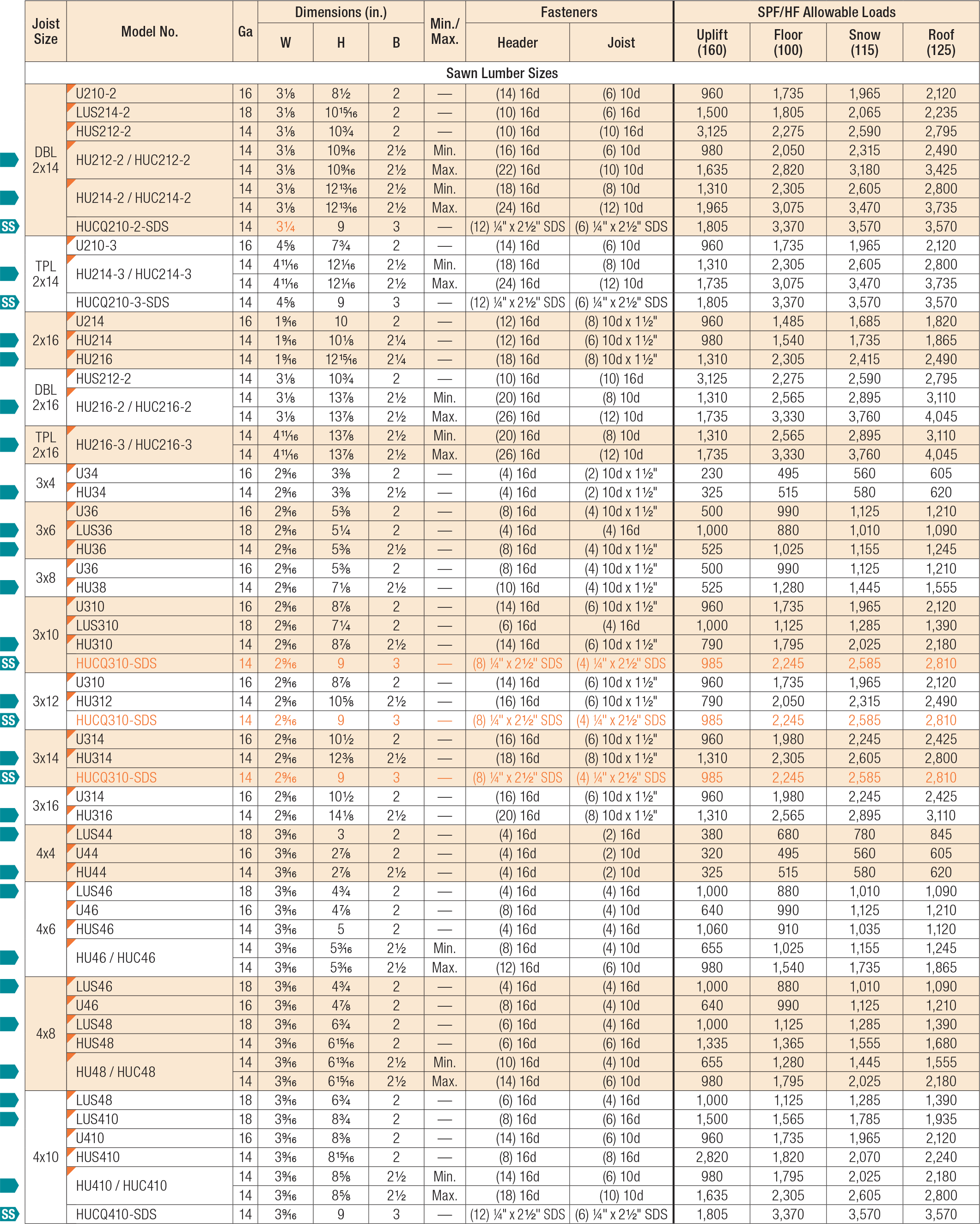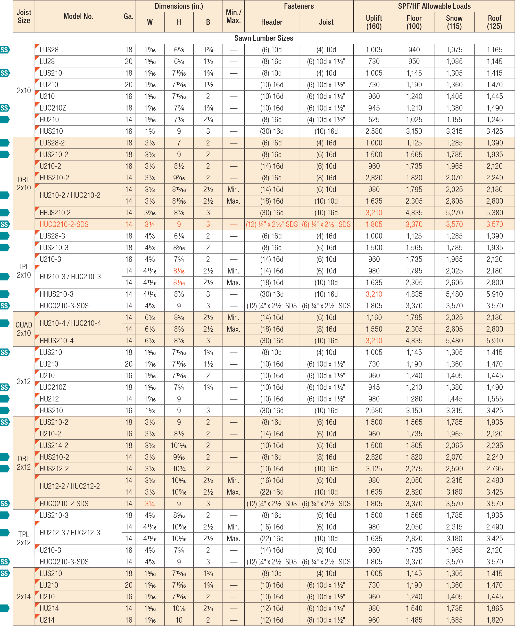 These models are approved for installation with the Strong-Drive® SD Connector screw. See the load values below.